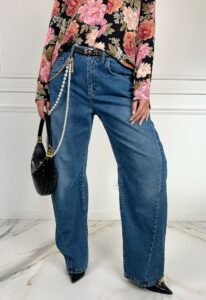 These balloon fit, wide-leg jeans embody a sophisticated metropolitan aesthetic. With a classic fit, they offer urban versatility, allowing for a variety of stylistic expressions. Their flared silhouette makes them ideal for an elegant and contemporary look, perfect for those who want to stand out with a touch of modernity.