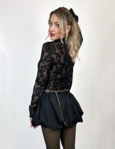 A sophisticated and feminine dress, perfect for the holidays and special occasions. The finely crafted black lace top adds a touch of elegance and sensuality, while the balloon-effect skirt in shiny fabric adds volume and movement, making the look unique and unforgettable. This dress is designed for those who want to stand out and capture attention with style and sophistication.