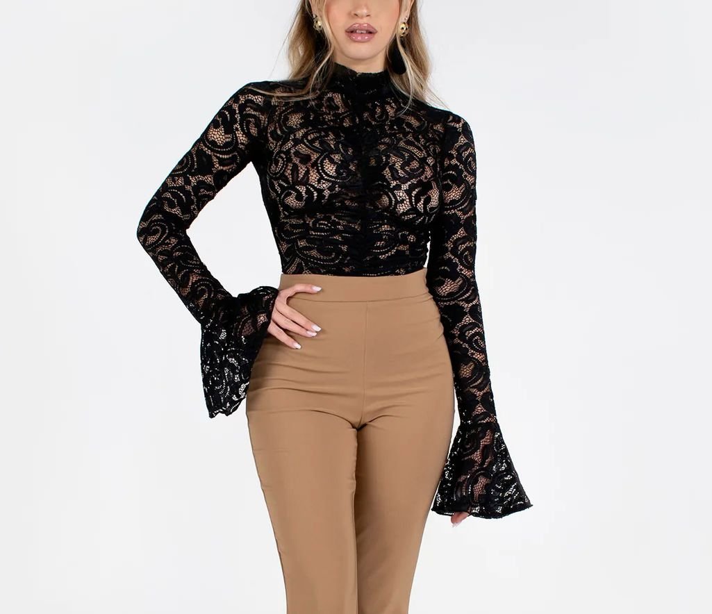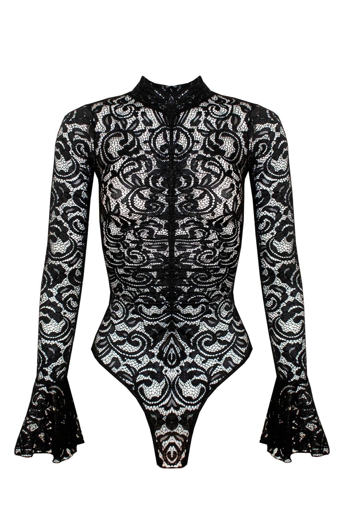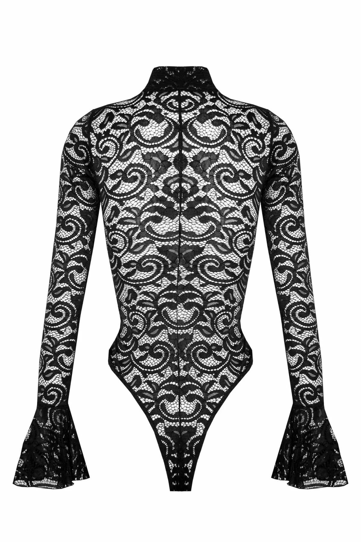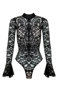 The body Delight thanks to the charm of lace gives a modern and sophisticated silhouette. Long sleeves with bell bottom give a timeless elegance. This leotard is perfect for evening events or special occasions where every detail counts.