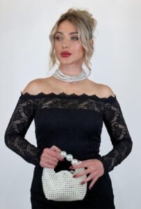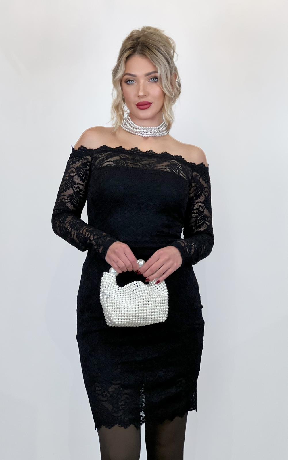 Timeless and sensual: elegant lace bodycon dress with Bardot neckline. Perfect for evenings, parties and elegant dinners. A garment that enhances your curves with class. Recommended for those seeking a bold yet elegant look, this dress is perfect to stand out with class. The midi length makes it versatile for various evening occasions. It comes with an easy zip fastening at the back.
