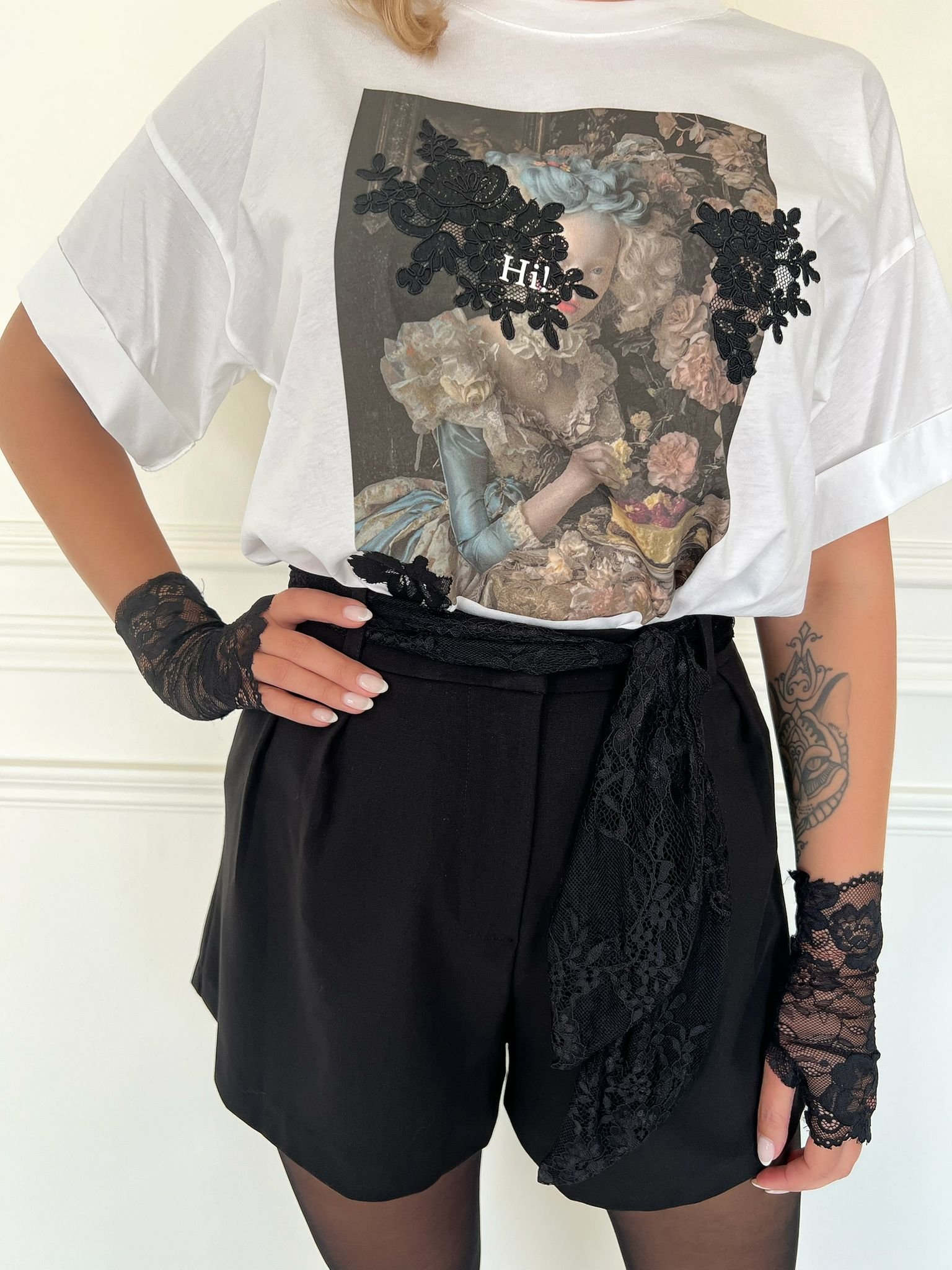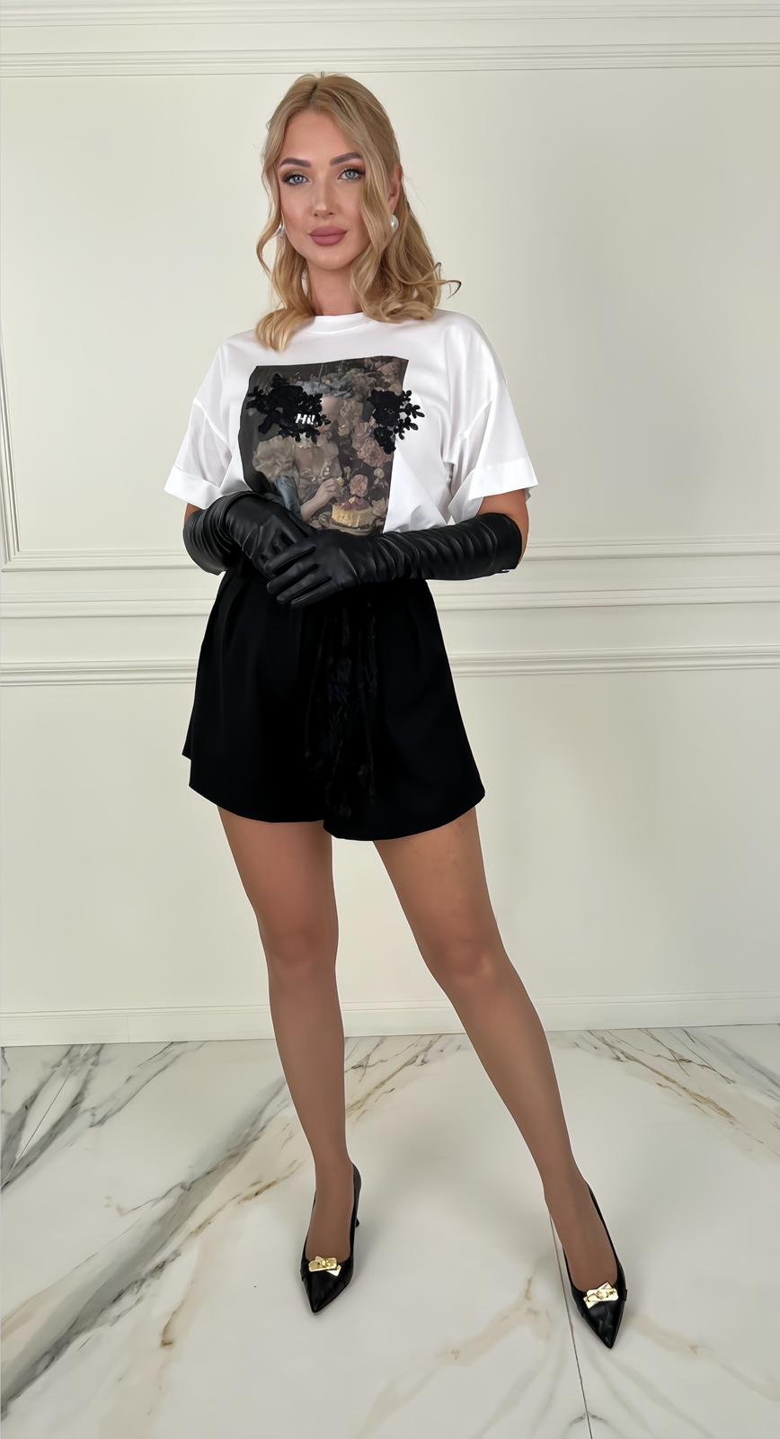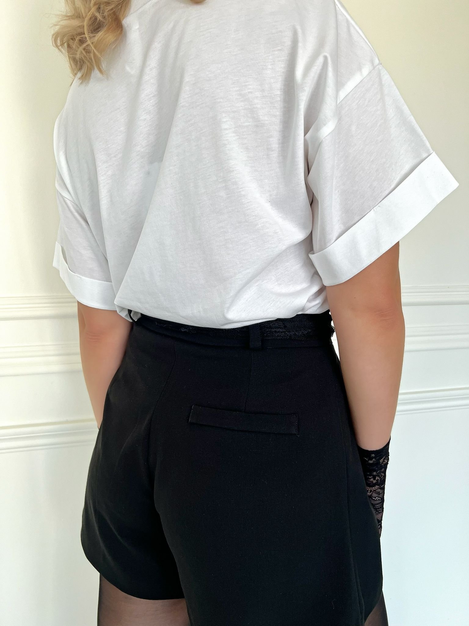 This black wide shorts features front pleats, a pocket at the back and comes high waisted. You can dress it up with a blouse for an evening look or dress it down with a t-shirt for a morning look.