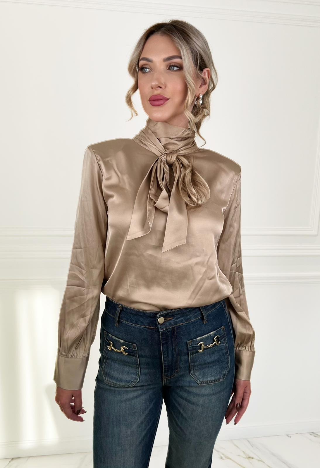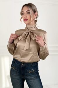 This blouse features a high neck collar and French bow design, with buttons at the back, long sleeves, a fitted silhouette, and a lustrous finish.