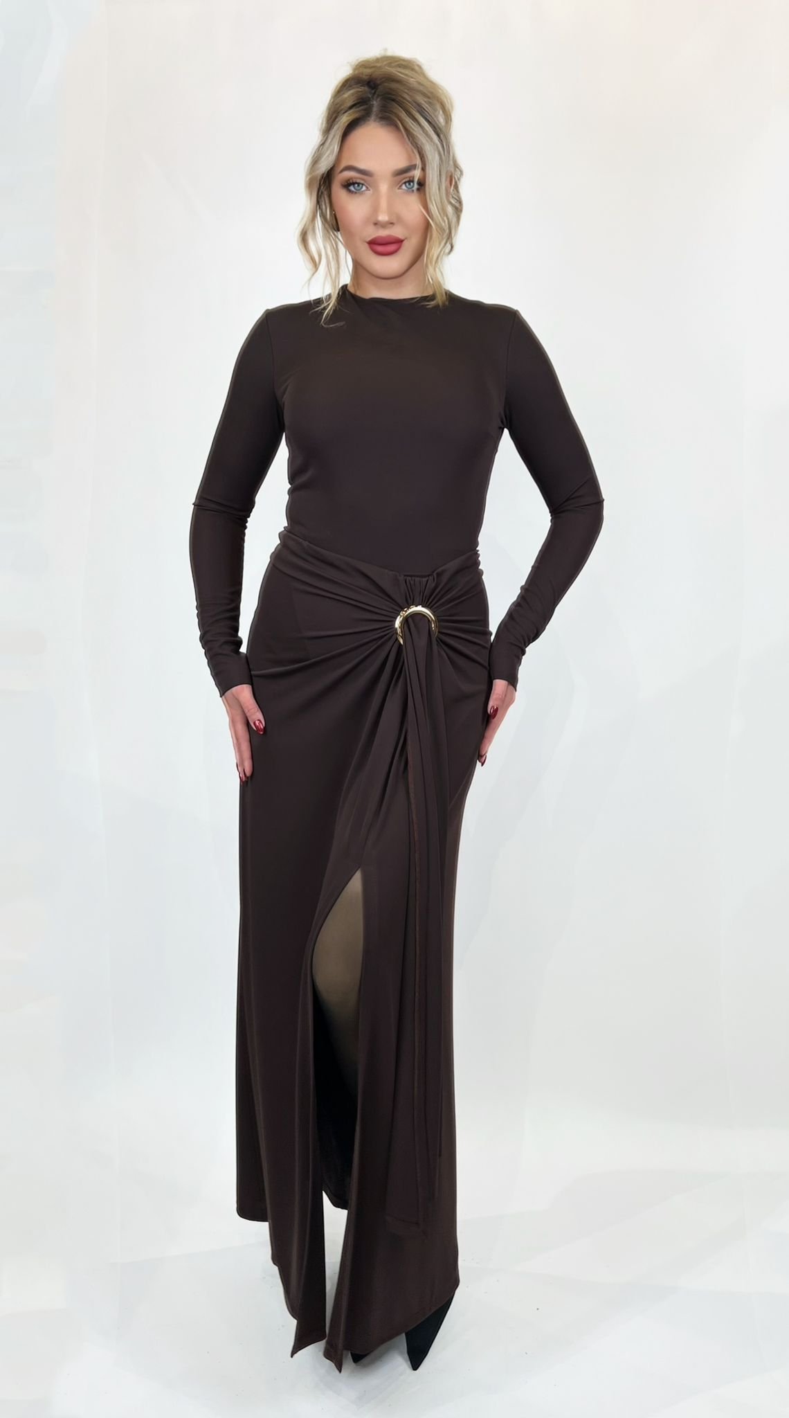 This co-ord set features a high neck, long sleeved, body top with a bodycon fit and high rise maxi skirt with a drape detail in the front. Set is sold as one piece. Material is soft and stretchy.