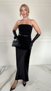 This set comes with a sleeveless, long top with a pared-back silhouette and a straight neckline together with and easy back zip fastening, and a long satin skirt. A slim belt accentuates the waist, creating a defined silhouette that accentuates your individuality. The clean cut and sleek length allow for contemporary combinations for formal or evening occasions. Â Â Â
