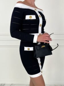 The set features a matching black and white top and skirt made from a soft yet stretchy fabric. The set design ensures a comfortable and flattering fit for all body types. The top is designed off the shoulder, with long sleeves, while the skirt features a flattering high-waisted fit. To compliment this set, a touch of gold has been added with the buttons giving the whole look a classical touch together with a mesh detail in both the top and skirt.