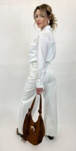 Make a statement in these vintage-inspired white denim trousers. Combining a relaxed, wide-leg silhouette with intricate Western floral embroidery on the oversized front pockets, these jeans offer a modern twist on classic cowgirl style. Finished with a clean, high-waist fit and contrast stitching, they are the ultimate piece for a bold, monochromatic look.
