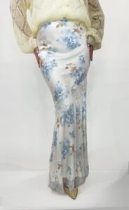 This stunning maxi skirt is crafted from a luxurious, high-lustre satin in a delicate off-white hue, adorned with a soft floral print in shades of cornflower and dusty blue.