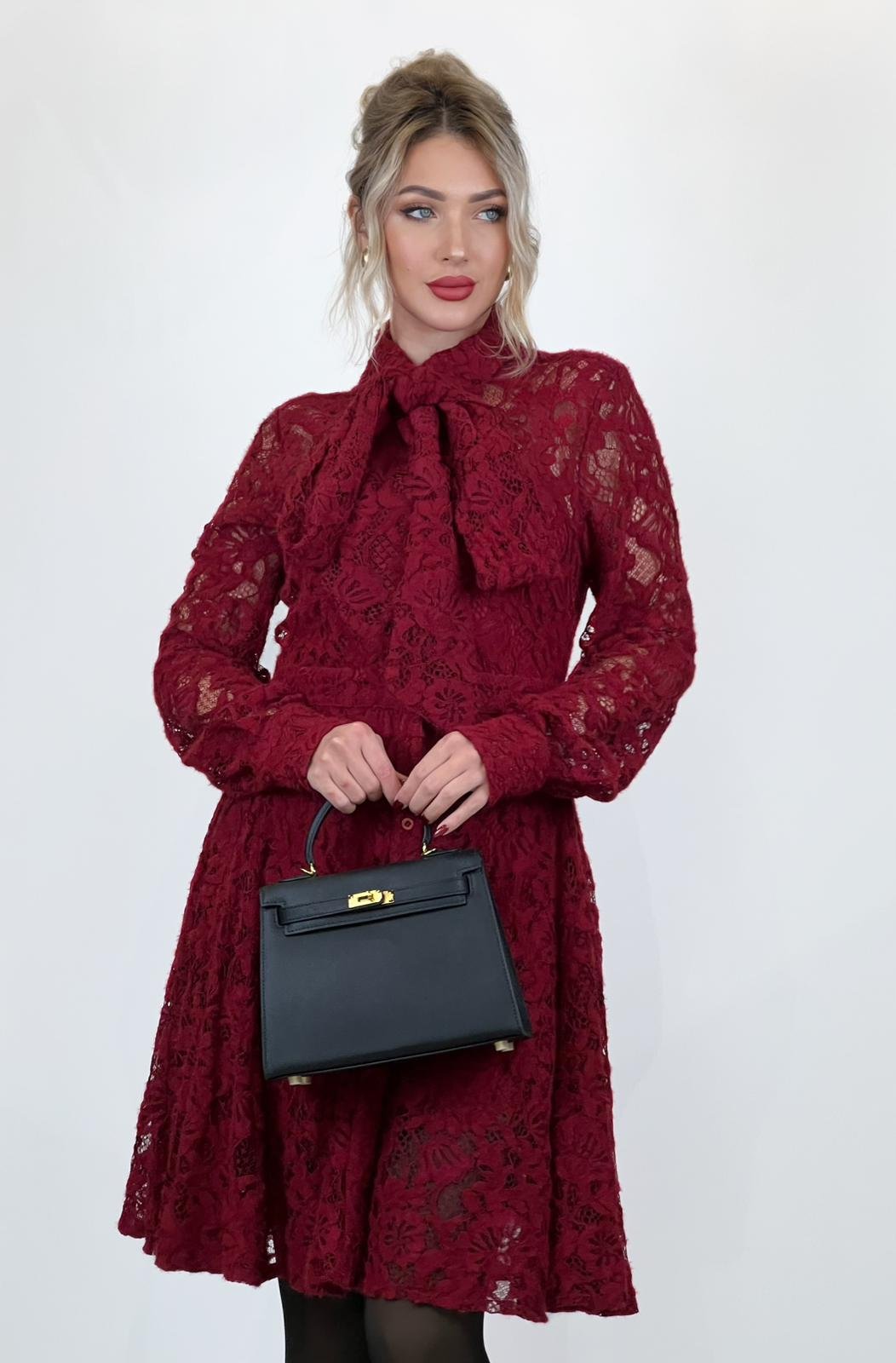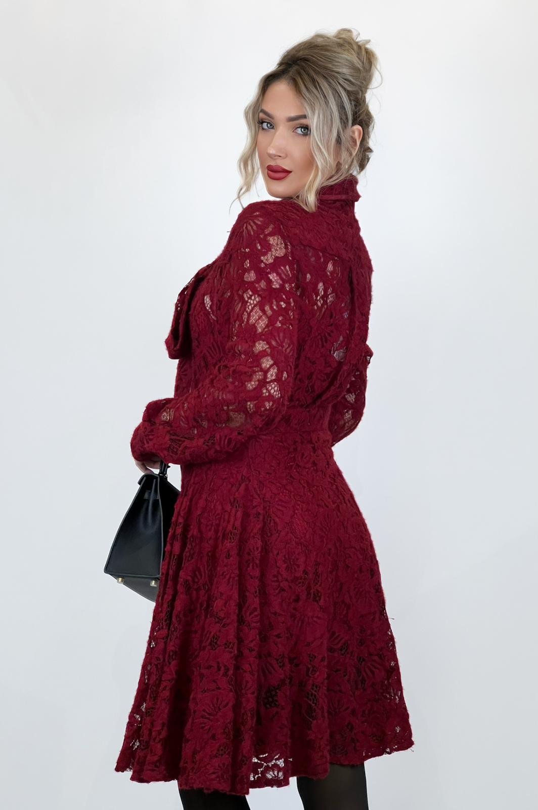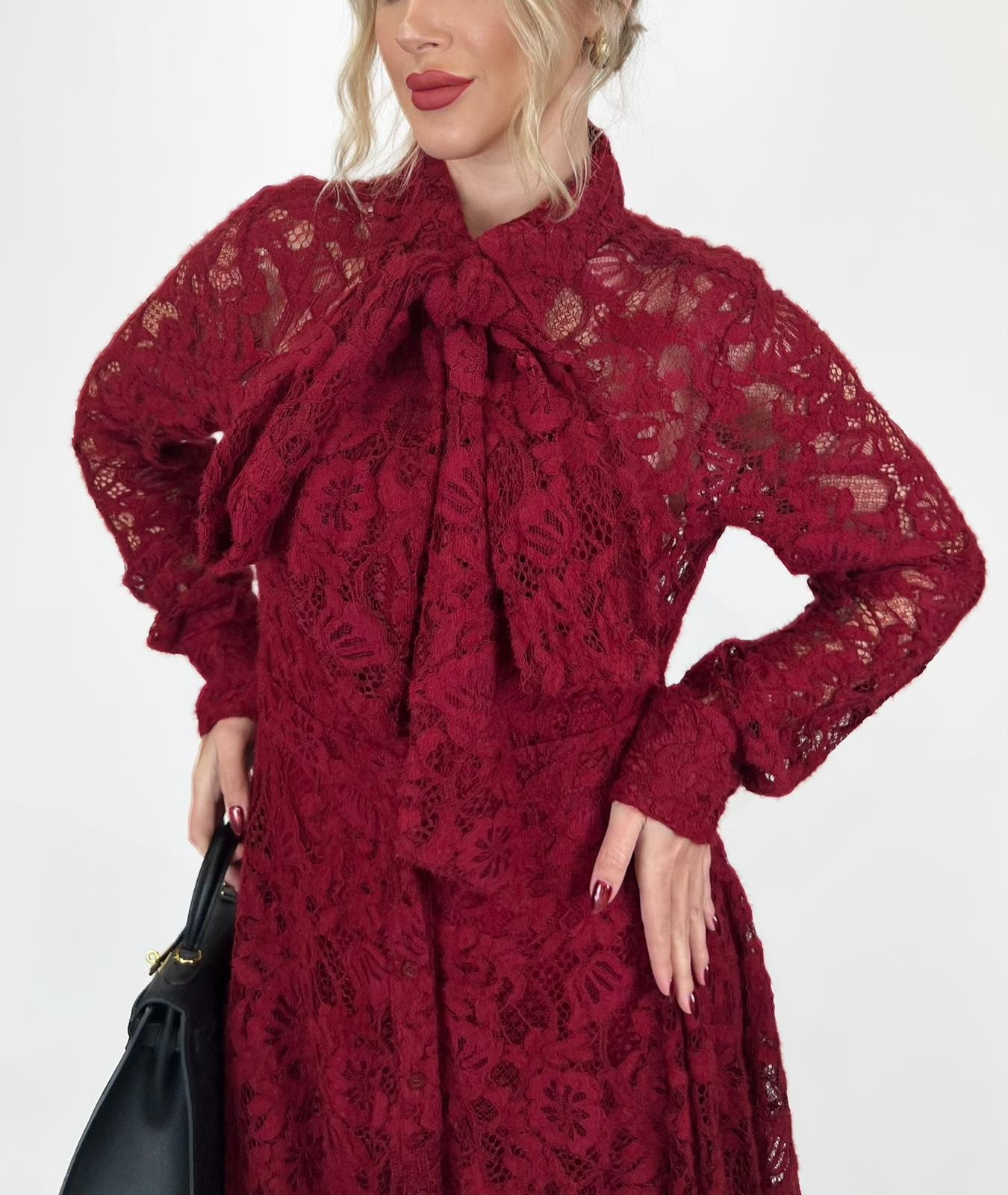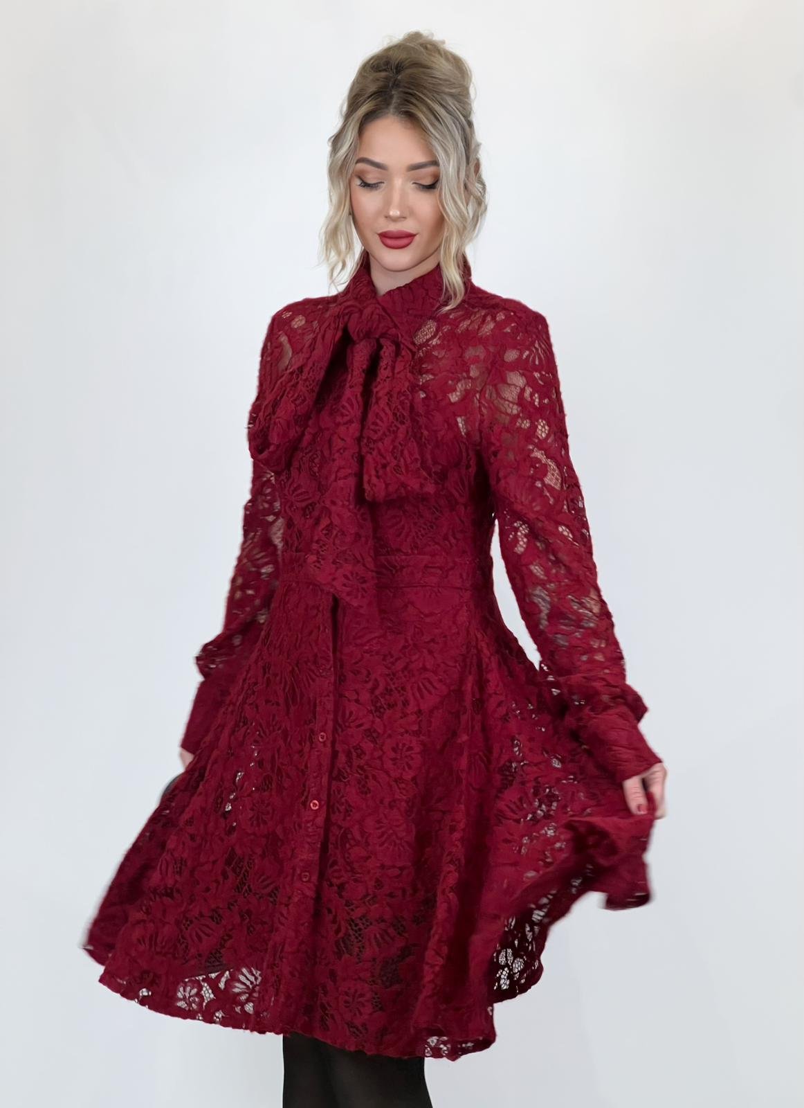 This dress is crafted from a soft, delicate lace that feels luxurious against the skin, with a partially lined interior to provide coverage without compromising style. The chic pussybow tie neck and long, sheer sleeves add a touch of vintage romance and sophistication.