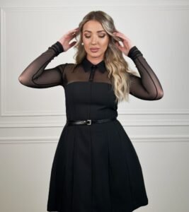 This short dress features sheer long sleeves and a classic pointed collar. The front button closure and slim waist belt enhance the silhouette, giving structure and definition. A refined choice for those seeking diverse, trend-driven options for sophisticated contemporary style.