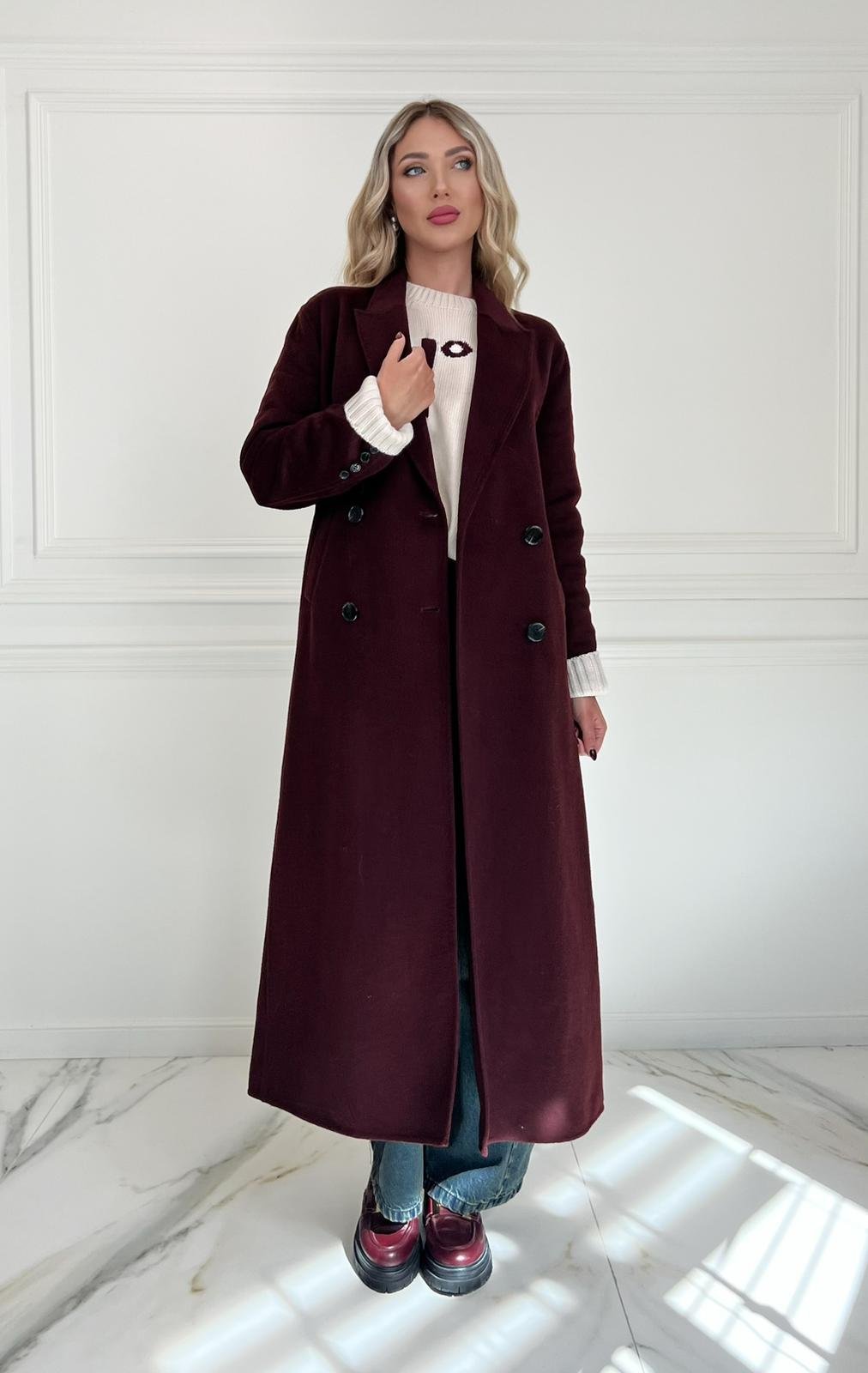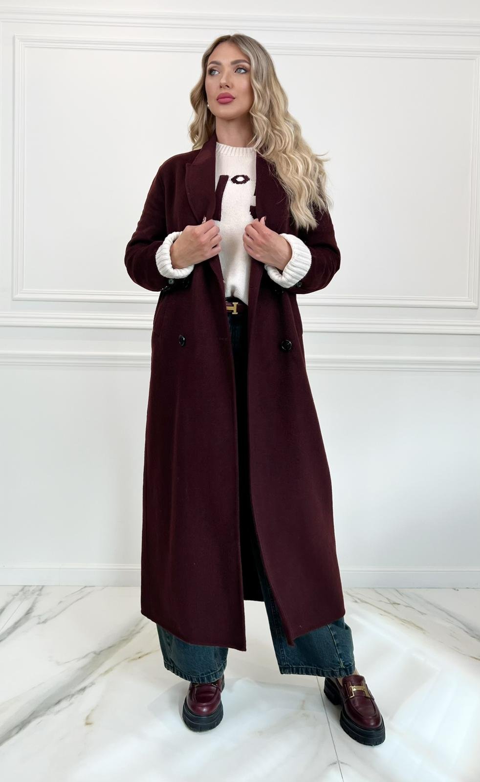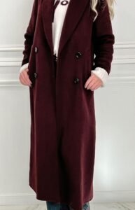 Discover this elegant and classic wool coat in a long, maxi and oversized fit. Featuring long sleeves, button fastening and two flap pockets. It comes in a classic burgundy colour.