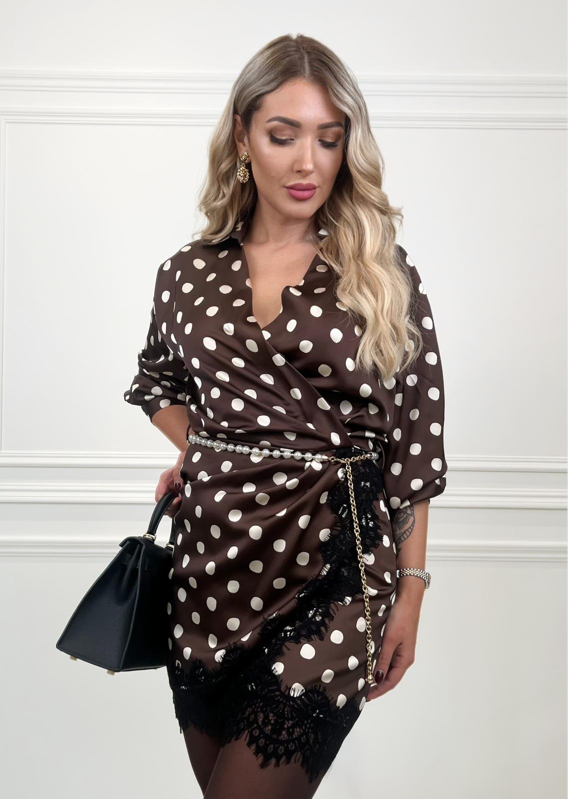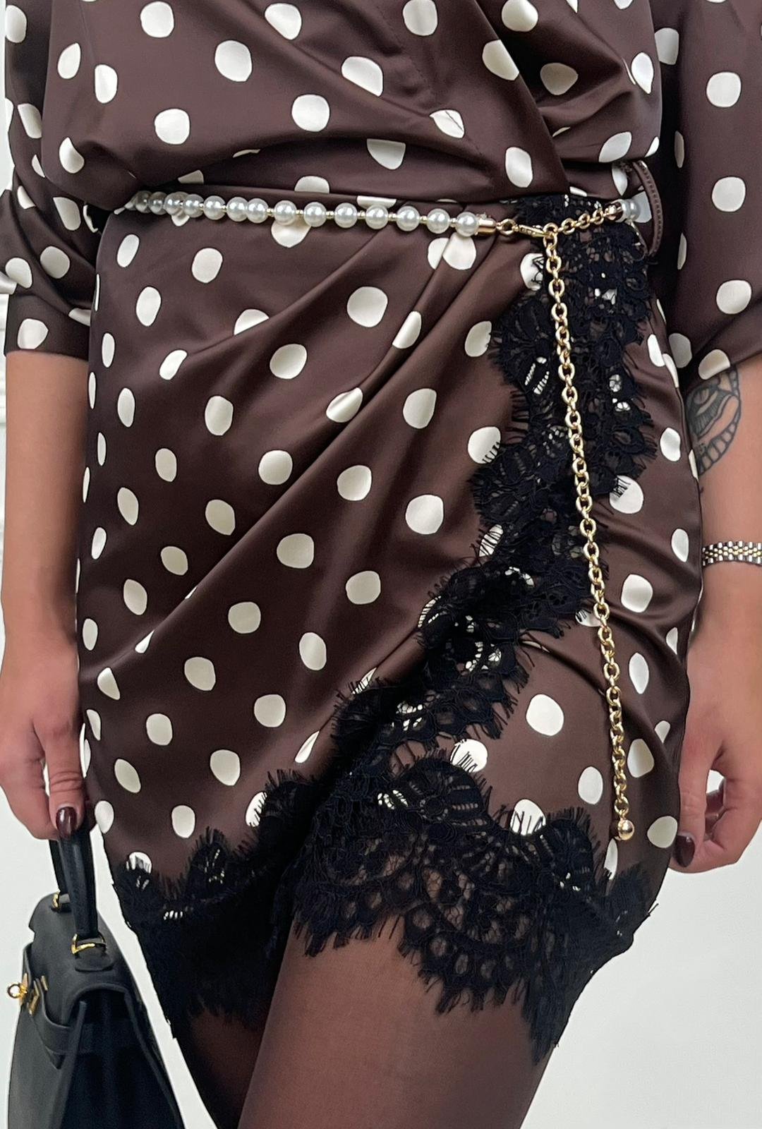 Classic polka dotted dress with a romantic twist. This brown dress features a collar, lace details and classic cuffs. Super adorable! True to size.