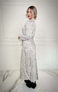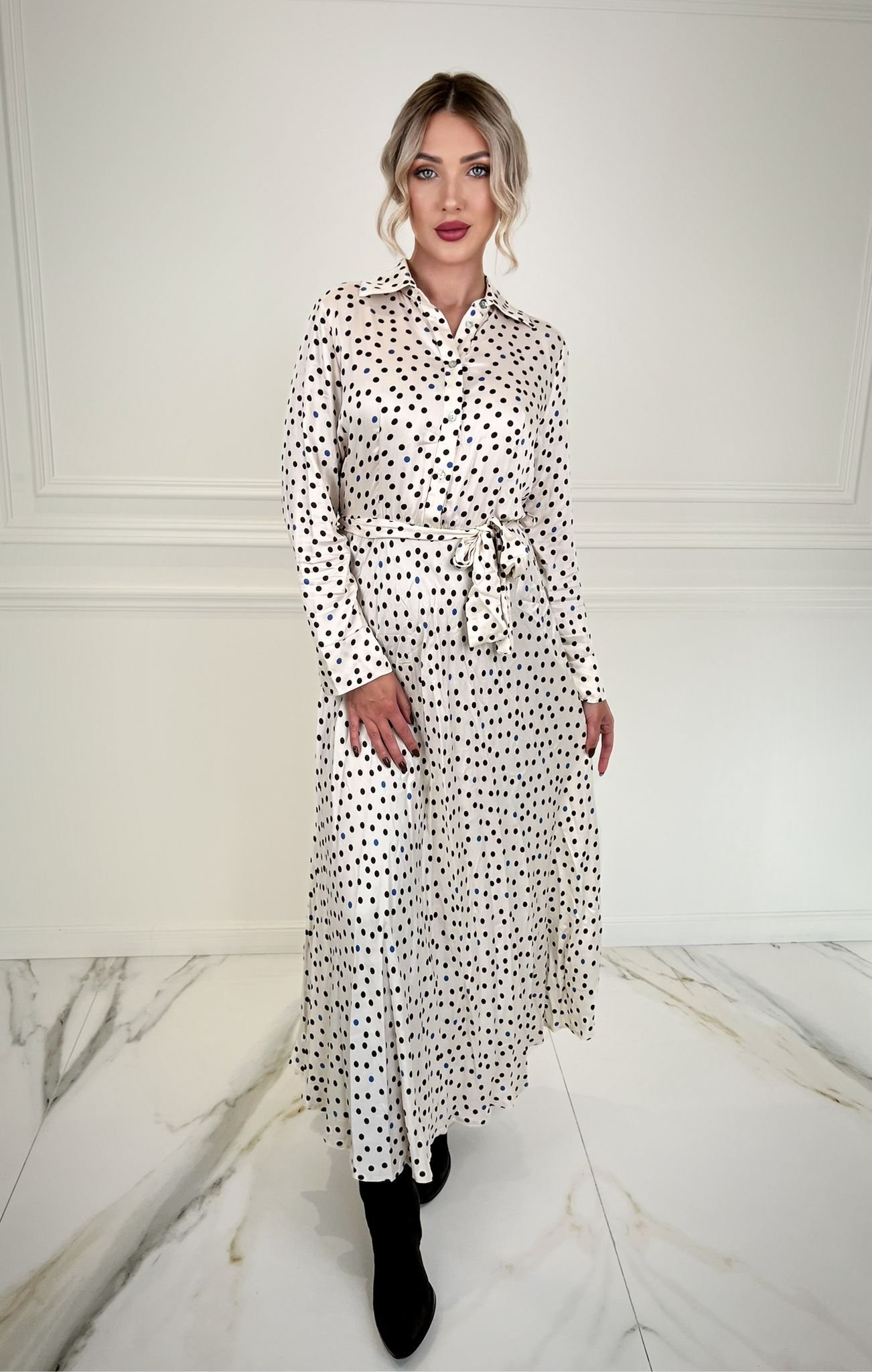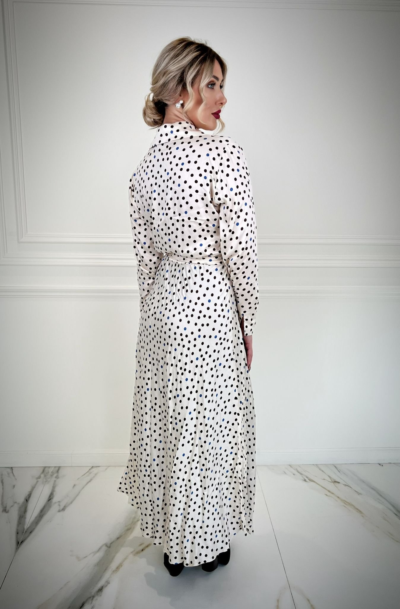 This polka dot midi dress stands out for its sophisticated silhouette, featuring a classic collar and front buttons. The belted waist sculpts the figure, while the long sleeves add a sophisticated touch. Ideal for city settings and for those who want to express their self.