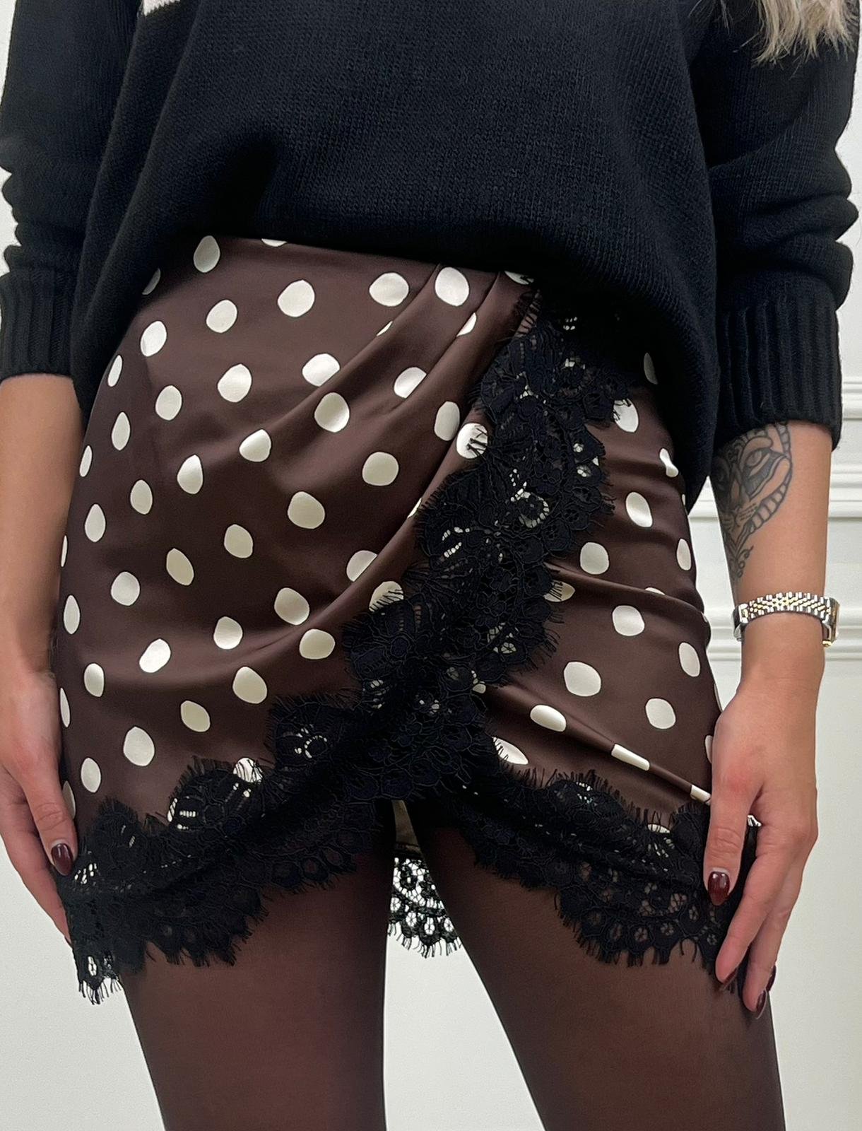 This polka dot skirt is a vibrant and feminine piece of clothing that is perfect for both day and night outfits. The skirt features side gathering, a lace detail around the hem and also an easy zip fastening at the back.