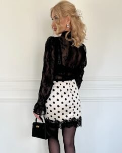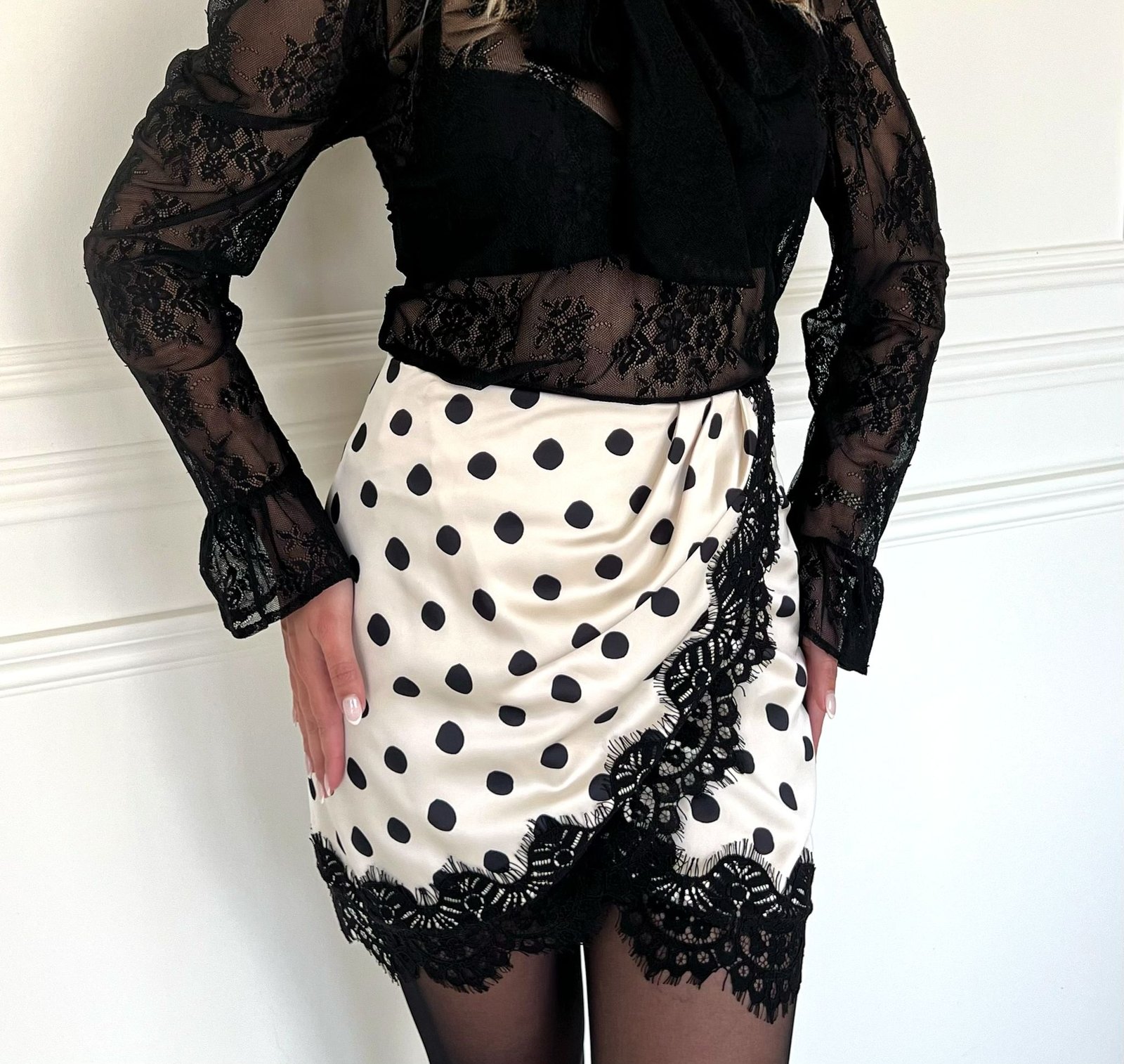 This polka dot skirt is a vibrant and feminine piece of clothing that is perfect for both day and night outfits. The skirt features side gathering, a lace detail around the hem and also an easy zip fastening at the back.
