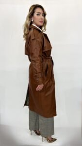 This chic and versatile outerwear is crafted from supple, buttery leather in a rich, chocolatey hue. It boasts an oversized, longline fit, a notch-lapel collar, button front closure, long sleeves with cinched cuffs, and two large pouch pockets at the waist. It’s complete with a silky, satin-lined interior and a self-tie waist belt for a snatched silhouette.