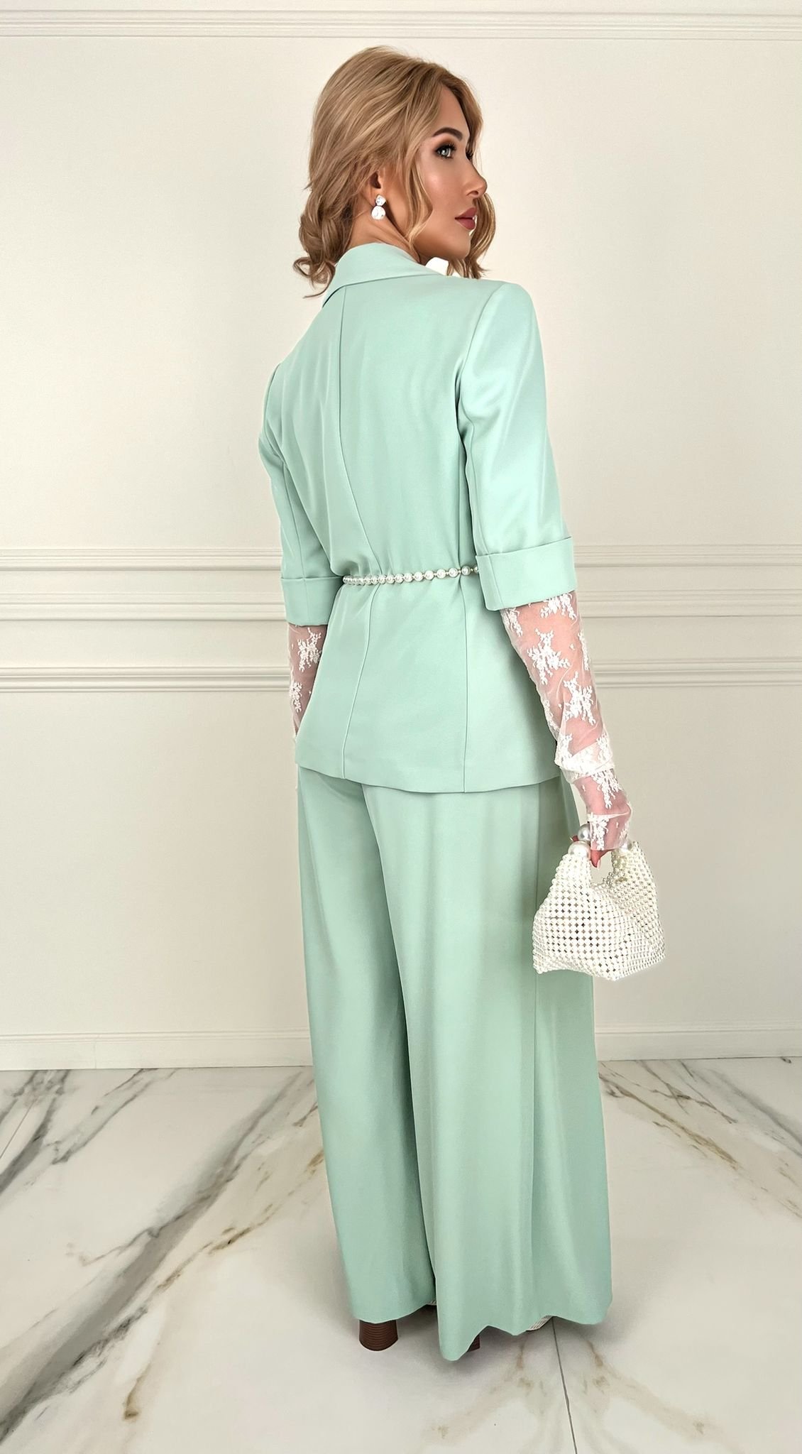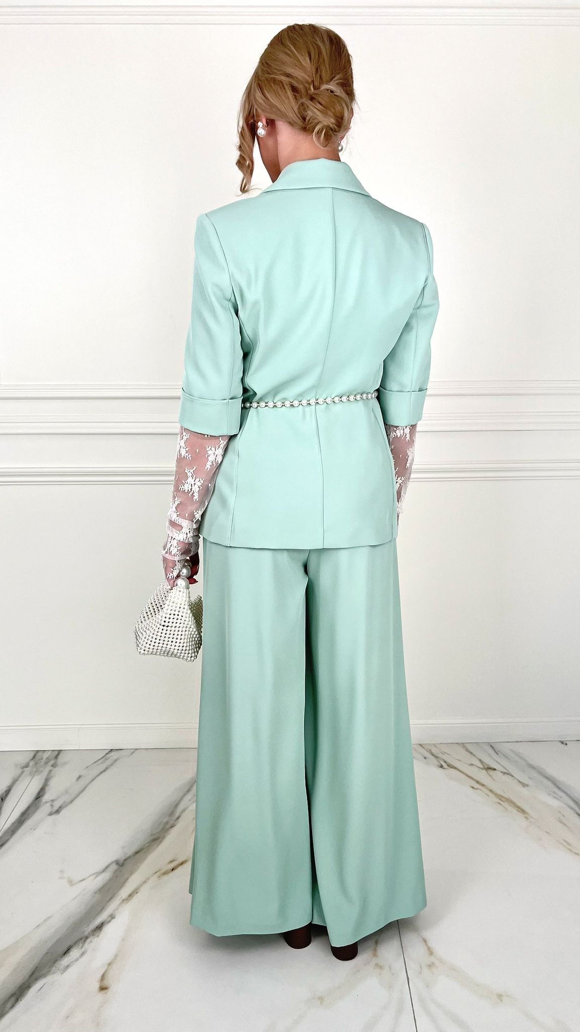 A versatile piece in a particular mint colour for those who love a touch of class in urban life. The flowing silhouette and high-waisted design are very flattering. The blazer also has a slit on each side while the trousers comes also with front pockets. Ideal for a formal look during the day or a special evening.