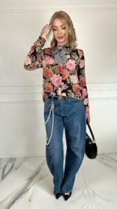 This beautiful vintage shirt in a loose fit comes with buttons, elegant cuffs and a separate scarf tied at the neck to create a very particular contrast. The soft pinks and greens on black background create a very vintage and classic look.