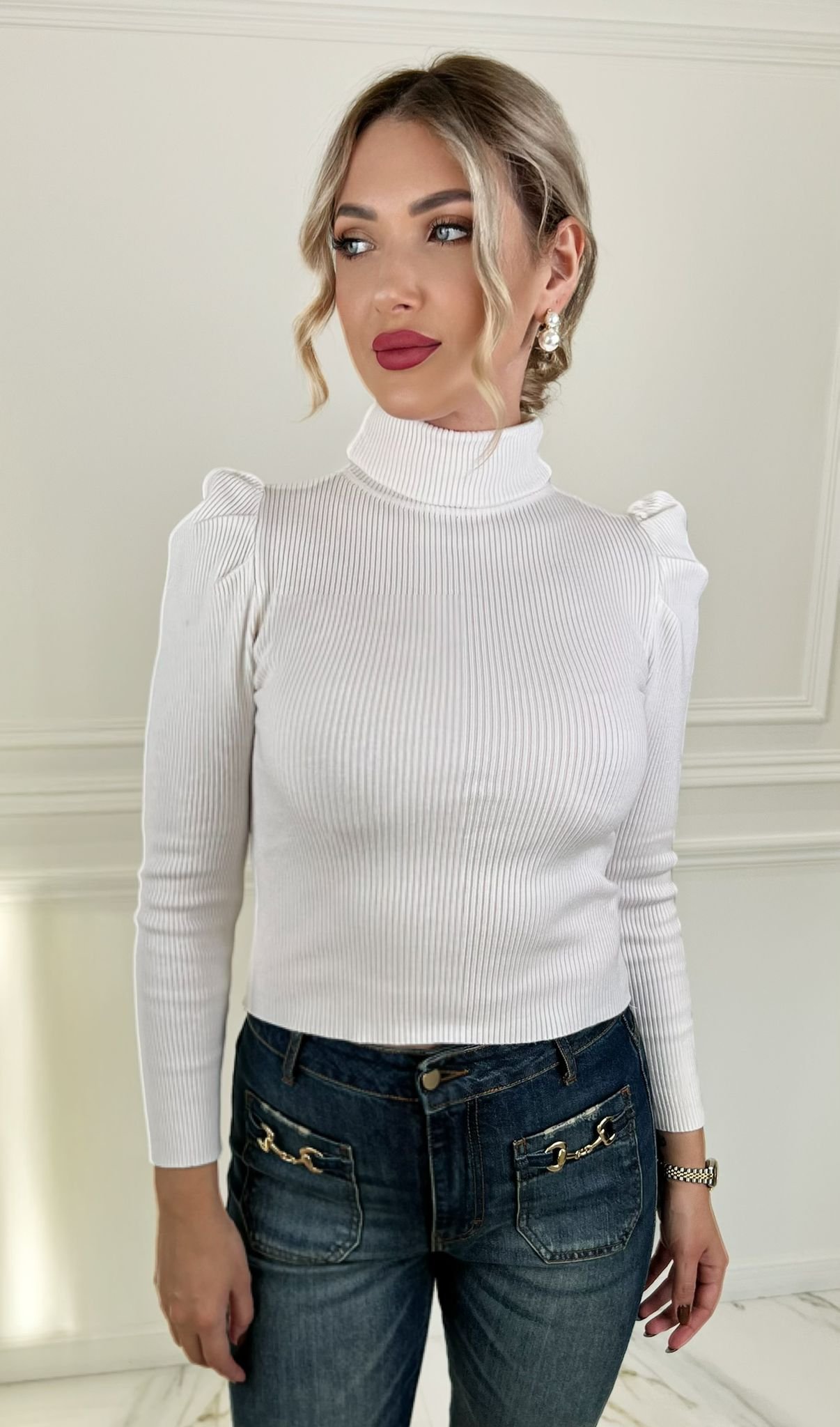 Featuring a ribbed material and puff long sleeves, this solid top is perfect to layer under vests, cardigans, shackets or to style with statement earrings!